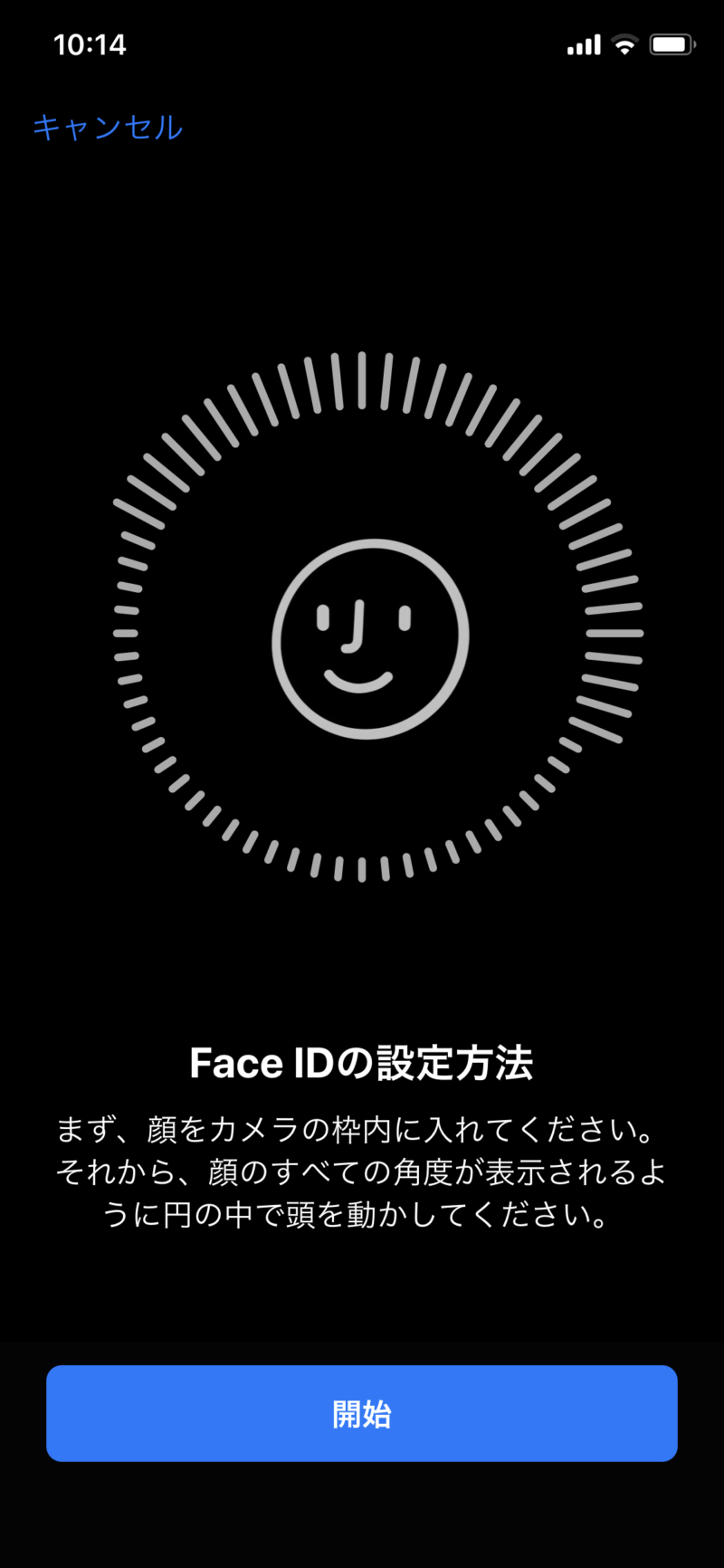 するとFace ID登録画面が表示されるので、「開始」をタップし、画面の案内に従って登録していけばOKです。
