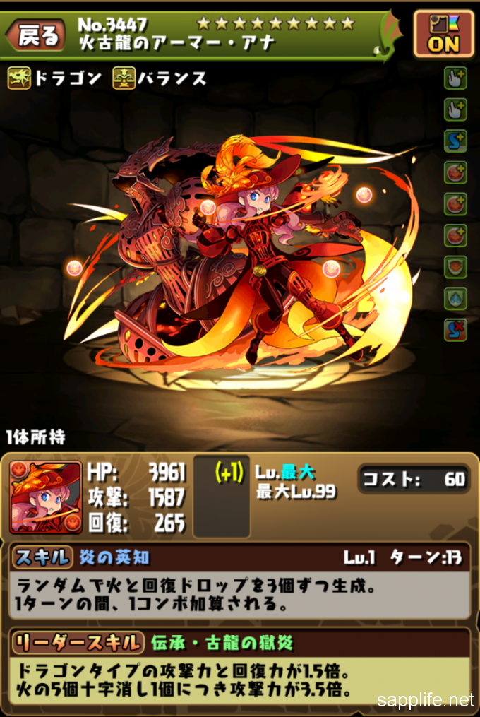 「火古龍のアーマー・アナ」に進化完了!「火古龍のアーマー・アナ」のステータス画面がこちら。※進化させる際にHPにプラスが1つついてしまっています。
