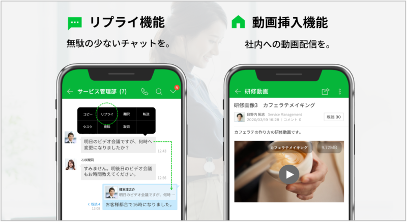 今回のアップデートでは、トークの「リプライ」「ボイスメッセージ」、ホームの「動画挿入機能」「テンプレート」機能が追加されるなど、現場業務や在宅ワークなど多様化する働きかたに合わせて、使いやすさの向上とコミュニケーション機能の拡張が行われています。