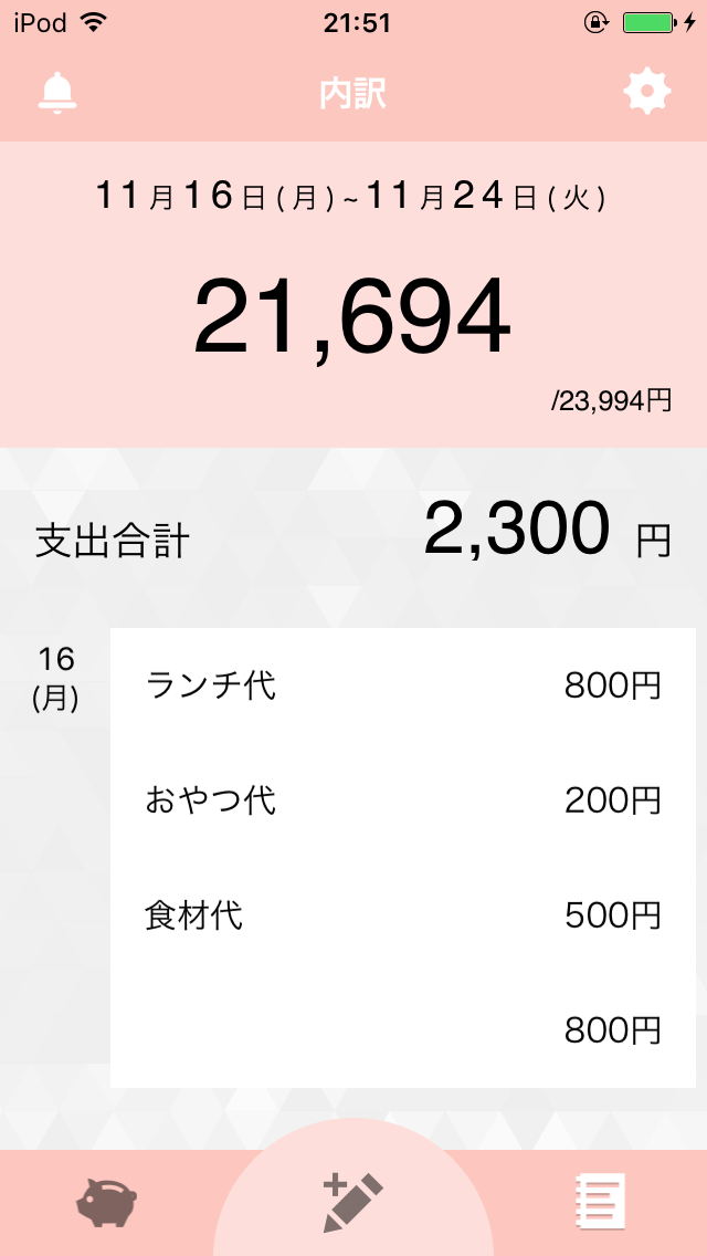 入力が完了すると、内訳に追加されます。後で、お金を使って追加で入力したいという場合は、画面下の鉛筆マークをタップすれば入力することができます。